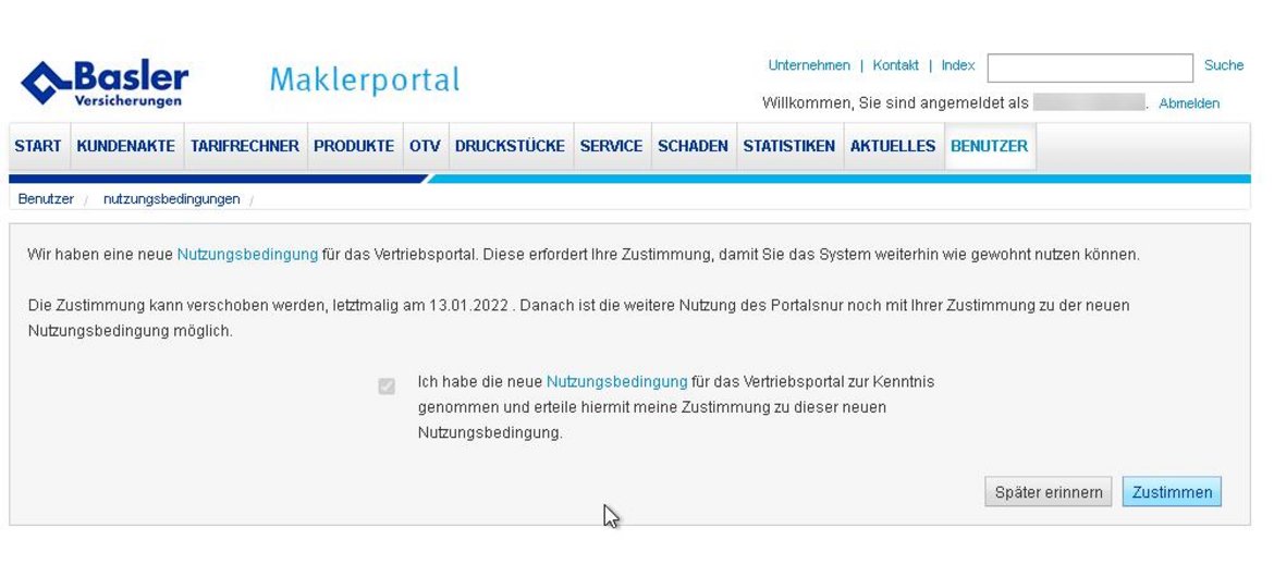 Wichtig: Wenn Sie für den BiPRO-User das Passwort vergeben haben, müssen Sie sich einmal einloggen und der Nutzungsvereinbarung (siehe Bild unten) zustimmen - erst danach funktioniert der Abruf!
