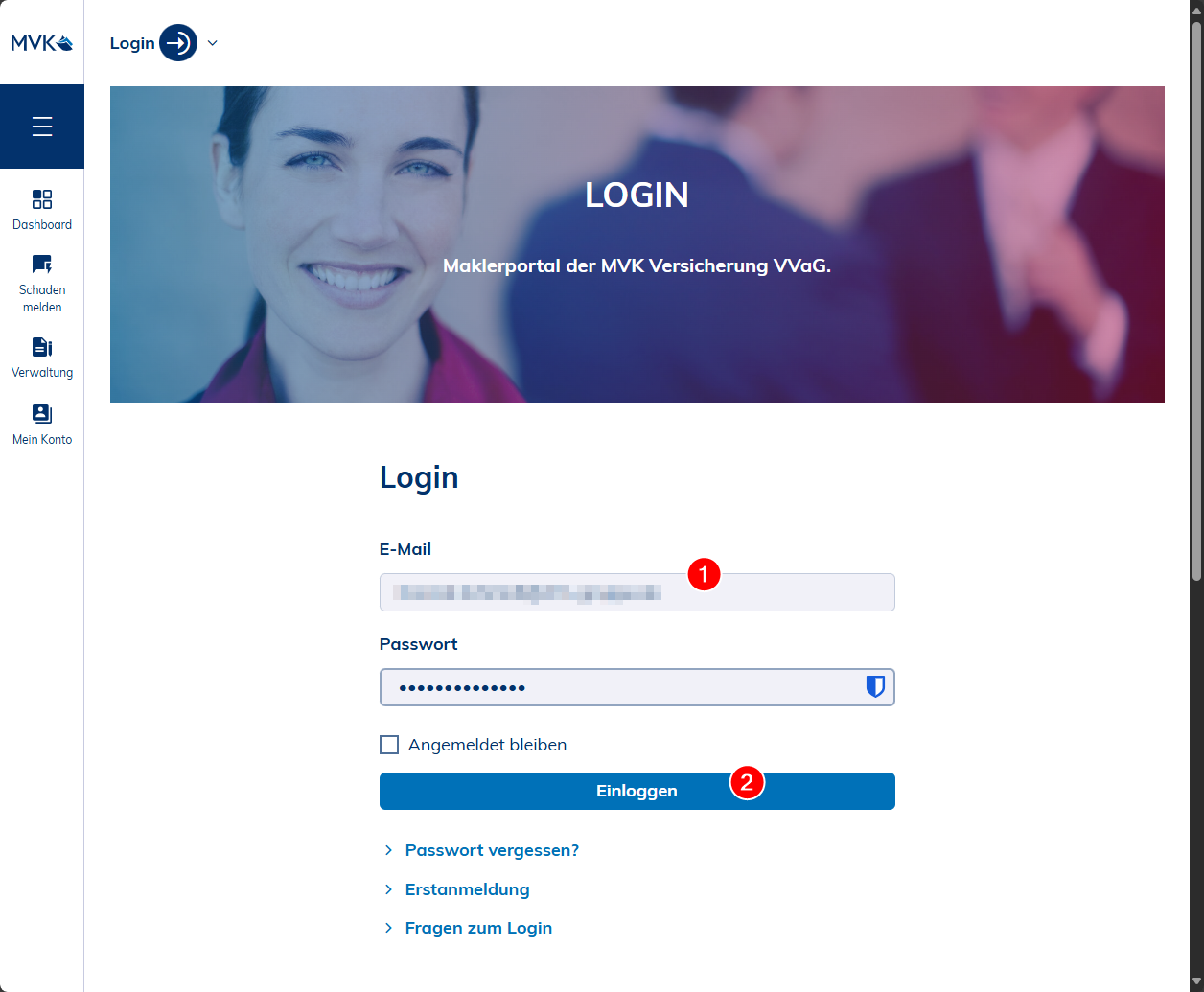 Geben Sie Ihre Zugangsdaten (1) ein und melden Sie sich mit dem Button "Anmelden" (2) an.