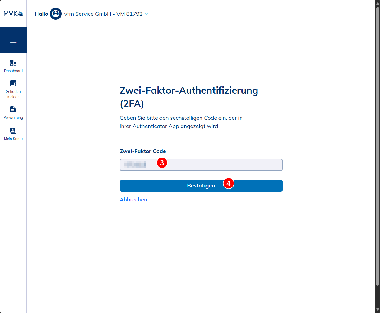 Geben Sie den 2FA-Code aus Ihrer Authentifikation-App ein (3) und klicken auf “Bestätigen” (4).