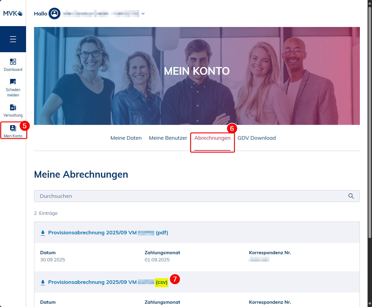 Klicken Sie im linken Menü auf “Mein Konto” (5), wählen dann “Abrechnungen” (6) und laden sich die benötigte CSV-Datei herunter (7).